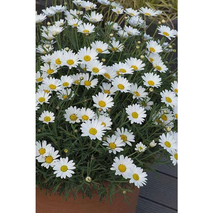 An evergreen shrub or perennial with white daisy like flowers with yellow centres and a more woody composition. It’s also known as a Marguerite daisy. The blooms attract butterflies and make gorgeous cut flowers and will flower from summer to autumn. It works well in a border or planter and can be kept in henhouse over winter for protection for frost. They have a neat compact growth.