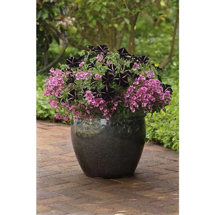 Petunia ‘Pinstripe’ have a good weather resistance they have an upright, mounding habit. Ideal for hanging baskets and planters. The trumpet shaped flowers are dark, velvet purple, almost black, with pink stripes slashing through the middle of the petal to centre.